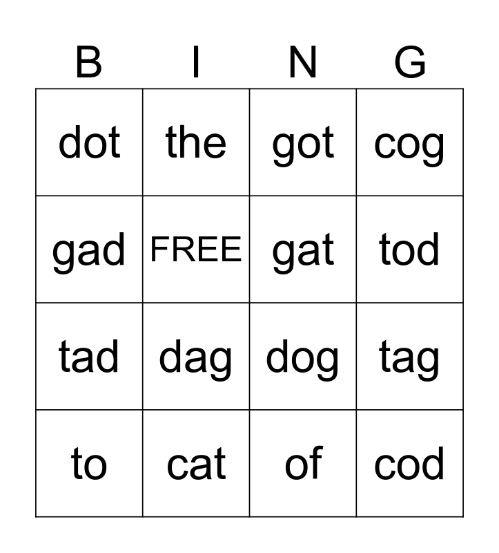 This bingo card has 16 words: cat, tag, got, dot, tad, the, dog, of, gad, FREE, to, cog, dag, tod, gat and cod.