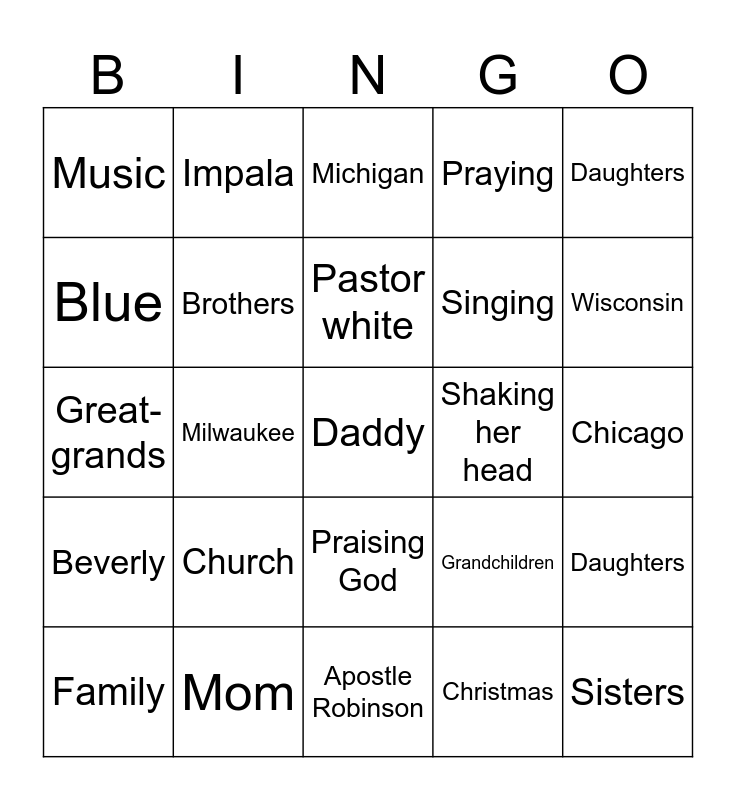 This bingo card has 25 words: Church, Apostle Robinson, Pastor white, Family, Daughters, Music, Blue, Impala, Shaking her head, Praising God, Singing, Great-grands, Grandchildren, Daughters, Brothers, Sisters, Chicago, Michigan, Wisconsin, Milwaukee, Daddy, Mom, Beverly, Praying and Christmas.