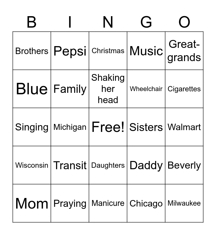 This bingo card has a free space and 35 words: Church, Apostle Robinson, Pastor white, Family, Daughters, Music, Blue, Impala, Shaking her head, Praising God, Singing, Great-grands, Grandchildren, Cooking, Brothers, Sisters, Chicago, Michigan, Wisconsin, Milwaukee, Daddy, Mom, Beverly, Praying, Christmas, Cigarettes, Dressing up, Glasses, Wheelchair, Walmart, Travel, Manicure, Transit, Pepsi and Coffee.