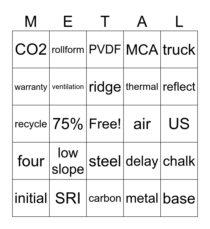 This bingo card has a free space and 44 words: risk, base, roof, initial, energy, metal, PVDF, CCS, truck, SRI, MCA, air, steel, low slope, cooling, carbon, fade, recycle, 60 yrs., reflect, rollform, 40%, eave, CO2, on-site, US, durable, waste, delay, four, CRRC, chalk, EPD, life cycle, 75%, urban, shingle, solar, ridge, warranty, thermal, length, ventilation and aluminum.