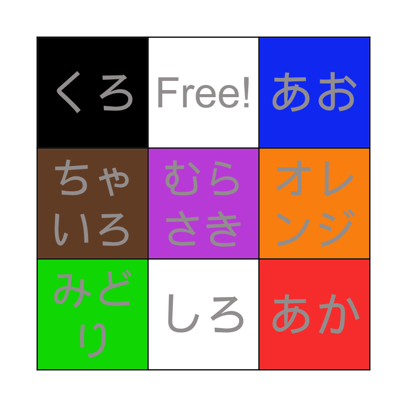 This bingo card has 11 words: あか, しろ, むらさき, みどり, Free!, あお, オレンジ, きいろ, ちゃいろ, くろ and ピンク.
