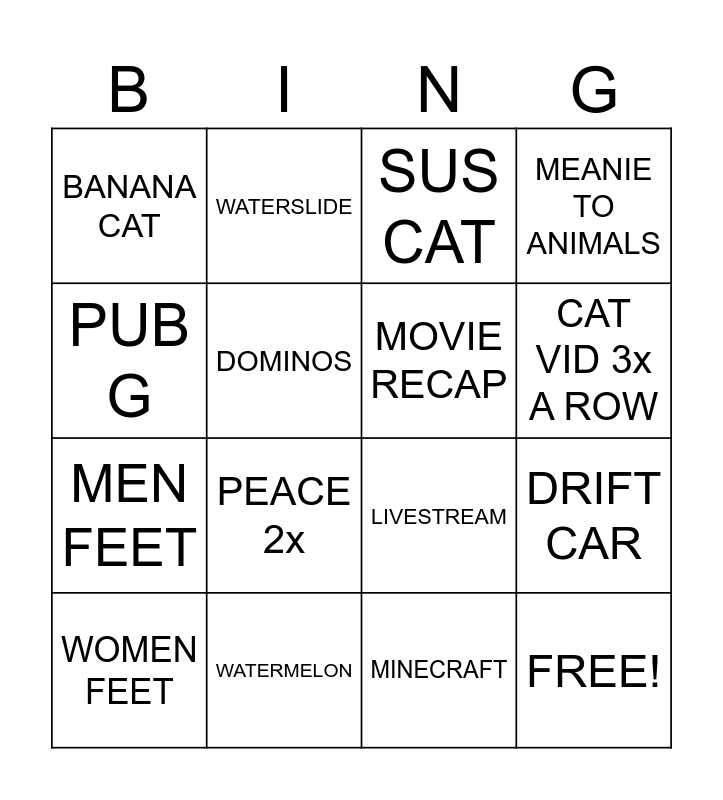 This bingo card has 16 words: WATERMELON, DRIFT CAR, SUS CAT, BANANA CAT, MEN FEET, WATERSLIDE, LIVESTREAM, MINECRAFT, PUB G, DOMINOS, WOMEN FEET, MEANIE TO ANIMALS, PEACE 2x, CAT VID 3x A ROW, MOVIE RECAP and FREE!.