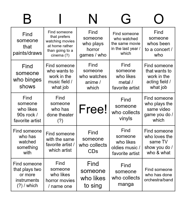 This bingo card has a free space and 24 words: Find someone with the same favorite artist / which artist, Find someone who likes horror movies / name one, Find someone who watches anime / which, Find someone that plays two or more instruments (?) / which, Find someone whos been to a concert / who, Find someone that paints/draws, Find someone who binges shows, Find someone that prefers watching movies at home rather than going to a cinema (?), Find someone who collects vinyls, Find someone who collects CDs, Find someone who likes metal / favorite artist, Find someone who likes 90s rock / favorite artist, Find someone who likes oldies music / favorite artist, Find someone who loves the same TV show you do / who & what, Find someone who wants to work in the music field / what job, Find someone who collects manga, Find someone who plays the same video game you do / which, Find someone who plays horror games / who, Find someone that wants to work in the acting field / what job, Find someone who has done theater (?), Find someone who has done orchestra/band, Find someone who has watched something with, Find someone who watched the same movie in the last year / which and Find someone who likes to sing.