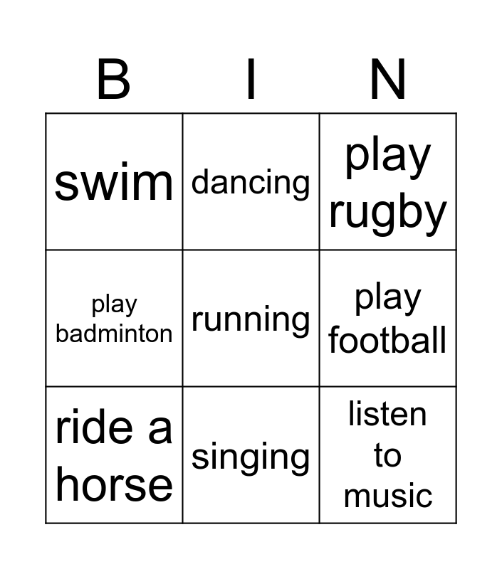 This bingo card has a free space and 8 words: play football, play rugby, dancing, ride a horse, swim, listen to music, play badminton and singing.