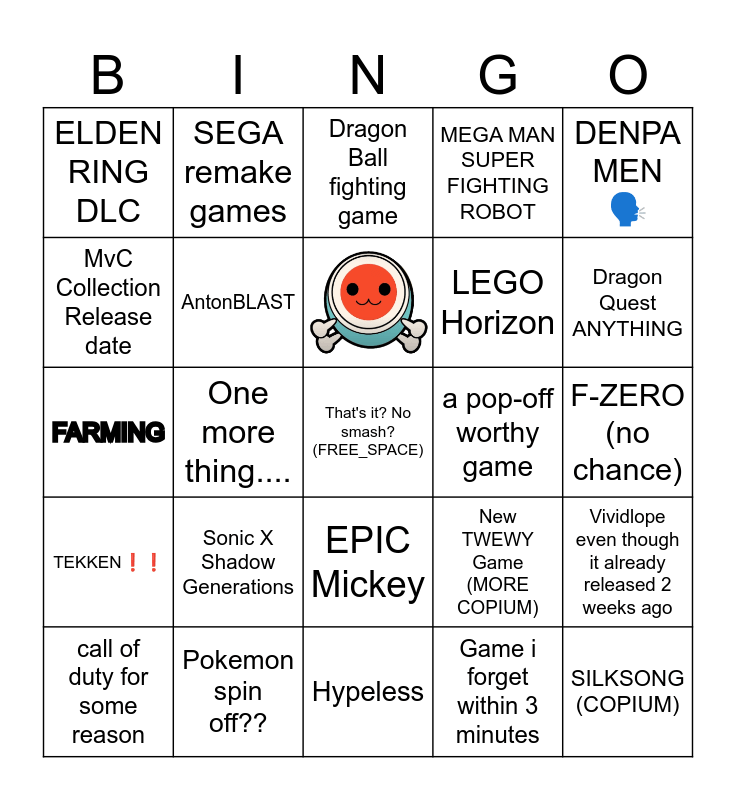 This bingo card has 1 images, a free space and 23 words: Sonic X Shadow Generations, Pokemon spin off??, call of duty for some reason, DENPA MEN🗣️, ELDEN RING DLC, MvC Collection Release date, SEGA remake games, a pop-off worthy game, EPIC Mickey, LEGO Horizon, FARMING, New TWEWY Game (MORE COPIUM), Vividlope even though it already released 2 weeks ago, AntonBLAST, Game i forget within 3 minutes, F-ZERO (no chance), Dragon Ball fighting game, Dragon Quest ANYTHING, One more thing...., SILKSONG (COPIUM), TEKKEN❗❗, MEGA MAN SUPER FIGHTING ROBOT and Hypeless.
