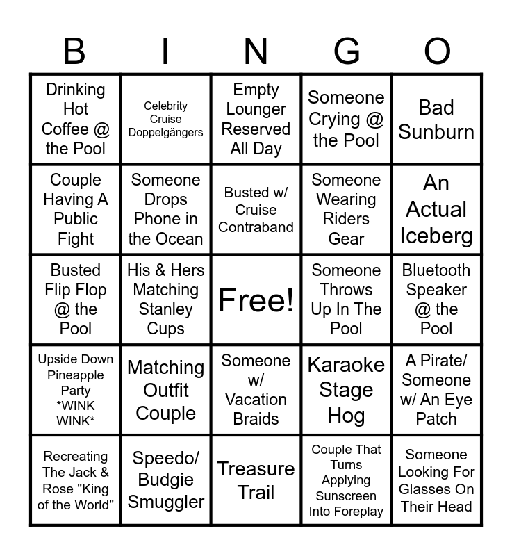 This bingo card has a free space and 24 words: Matching Outfit Couple, Speedo/ Budgie Smuggler, Busted w/ Cruise Contraband, Recreating The Jack & Rose "King of the World", Bad Sunburn, Drinking Hot Coffee @ the Pool, Couple Having A Public Fight, Celebrity Cruise Doppelgängers, Someone Throws Up In The Pool, Someone w/ Vacation Braids, Someone Wearing Riders Gear, Busted Flip Flop @ the Pool, Karaoke Stage Hog, A Pirate/ Someone w/ An Eye Patch, Someone Drops Phone in the Ocean, Couple That Turns Applying Sunscreen Into Foreplay, Bluetooth Speaker @ the Pool, Empty Lounger Reserved All Day, An Actual Iceberg, His & Hers Matching Stanley Cups, Someone Looking For Glasses On Their Head, Upside Down Pineapple Party *WINK WINK*, Someone Crying @ the Pool and Treasure Trail.