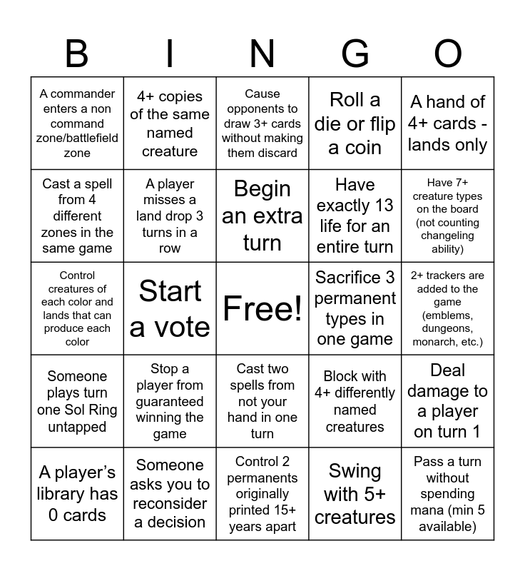 This bingo card has a free space and 34 words: Counterspell gets countered/fizzles, Swing with 5+ creatures, 3+ permanents on the battlefield that share a proper noun, Block a commander with a commander, Someone plays turn one Sol Ring untapped, A player misses a land drop 3 turns in a row, A hand of 4+ cards - lands only, A player’s library has 0 cards, 4+ copies of the same named creature, All 4 players wheel, Begin an extra turn, Cause opponents to draw 3+ cards without making them discard, 3 or more players lose the game in a single turn, Have more treasures than creatures, Sacrifice 3 permanent types in one game, Have 7+ creature types on the board (not counting changeling ability), Someone asks you to reconsider a decision, Control creatures of each color and lands that can produce each color, Stop a player from guaranteed winning the game, Block with 4+ differently named creatures, Cast two spells from not your hand in one turn, Control permanents containing every letter of the alphabet (flavor/rules ok), A commander enters a non command zone/battlefield zone, 2+ trackers are added to the game (emblems, dungeons, monarch, etc.), Control 2 permanents originally printed 15+ years apart, Pass a turn without spending mana (min 5 available), Roll a die or flip a coin, Pass turn with all permanents tapped (min 15), Have exactly 13 life for an entire turn, Cast a spell from 4 different zones in the same game, Pay for a Rhystic Study, Propaganda, and/or Smothering Tithe style effect 3 times, Start a vote, Deal damage to a player on turn 1 and Have 60+ life.