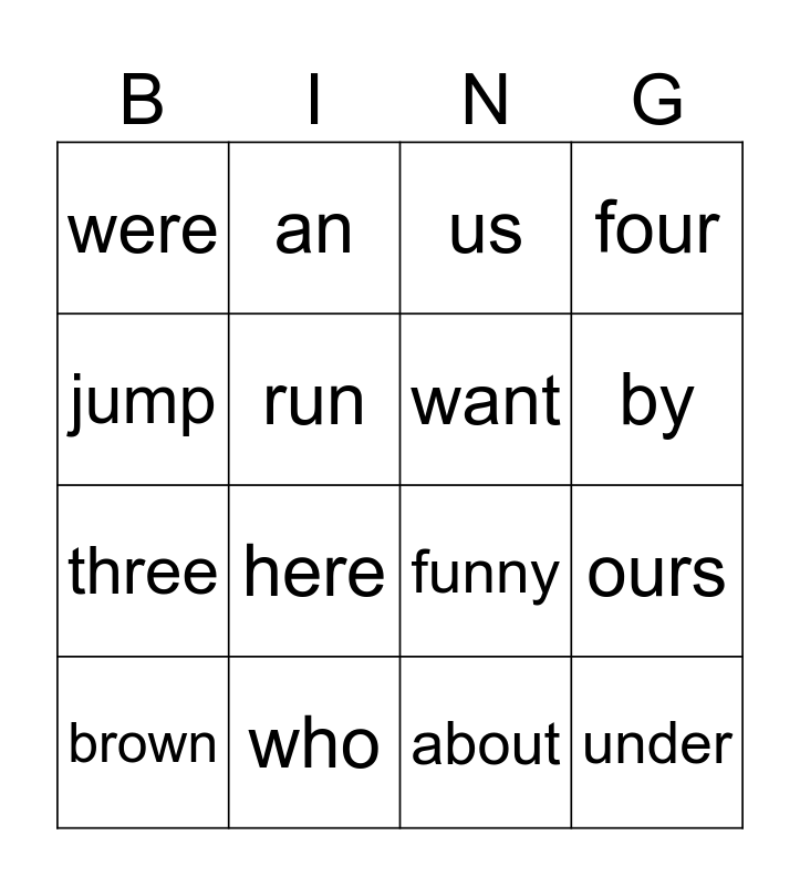 This bingo card has 16 words: who, ours, us, were, three, an, funny, about, jump, run, brown, four, here, by, want and under.