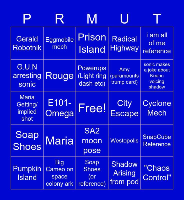 This bingo card has a free space and 24 words: Maria, Big Cameo on space colony ark, Powerups (Light ring dash etc), Pumpkin Island, i am all of me reference, Gerald Robotnik, G.U.N arresting sonic, Eggmobile mech, City Escape, SA2 moon pose, Amy (paramounts trump card), Maria Getting/ implied shot, Westopolis, SnapCube Reference, Rouge, Shadow Arising from pod, Cyclone Mech, Prison Island, sonic makes a joke about Keanu voicing shadow, E101-Omega, "Chaos Control", Soap Shoes, Radical Highway and Soap Shoes (or reference).