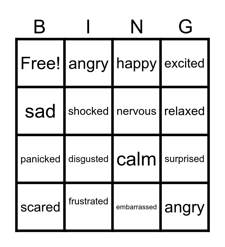 This bingo card has 16 words: scared, frustrated, happy, excited, sad, angry, calm, surprised, Free!, shocked, embarrassed, relaxed, panicked, disgusted, nervous and angry.