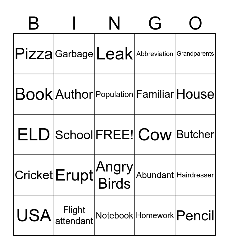 This bingo card has a free space and 27 words: Abundant, Scientist, Familiar, Notebook, Book, Leak, Garbage, Cricket, Cow, Hairdresser, ELD, Abbreviation, USA, Flight attendant, House, Weeds, Author, Population, Erupt, Pizza, Butcher, Homework, School, Pencil, Angry Birds, Grandparents and Sister.