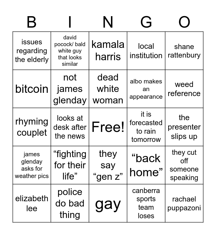 This bingo card has a free space and 46 words: disability + sport, rachael puppazoni, ukraine, gay, “fighting for their life”, james glenday says n degrees maybe even n+1, david pocock/ bald white guy that looks similar, israel-gaza, bitcoin, expressive statement during the weather, not james glenday, local institution, they cut off someone speaking, “back home”, trump, india reference, dead white woman, it is forecasted to rain tomorrow, china, shane rattenbury, looks at desk after the news, canberra sports team loses, issues regarding the elderly, albo makes an appearance, “mental health”, weed reference, elizabeth lee, the royals mentioned, they say “gen z”, james glenday asks for weather pics, hot weather, women’s sport before men’s, ANU mentioned, We see a place that we’ve been to, “cost of living crisis”, police do bad thing, the presenter slips up, a trigger warning, zoom interview, they try to warn you about an illness, bruce lehhrman, kamala harris, rhyming couplet, they say the n in government, andrew barr and white terrorists.