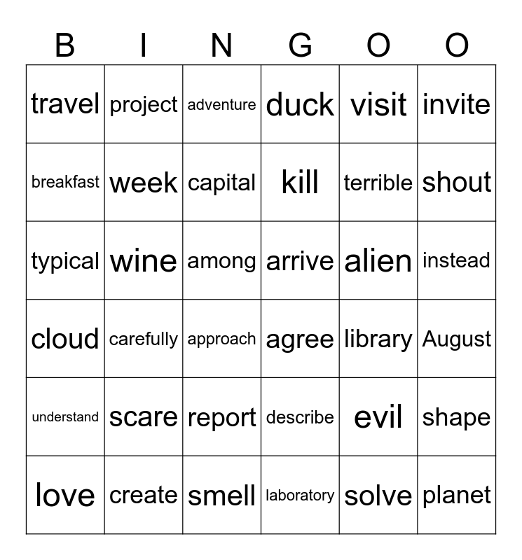 This bingo card has 61 words: Free!, agree, alcohol, arrive, August, boat, breakfast, camera, capital, catch, duck, enjoy, invite, love, month, travel, typical, visit, weather, week, wine, adventure, approach, carefully, chemical, create, evil, experiment, kill, laboratory, laugh, loud, nervous, noise, project, scare, secret, shout, smell, terrible, worse, alien, among, chart, cloud, describe, ever, fail, grade, instead, library, photograph, planet, report, several, shape, solve, suddenly, suppose, understand and view.