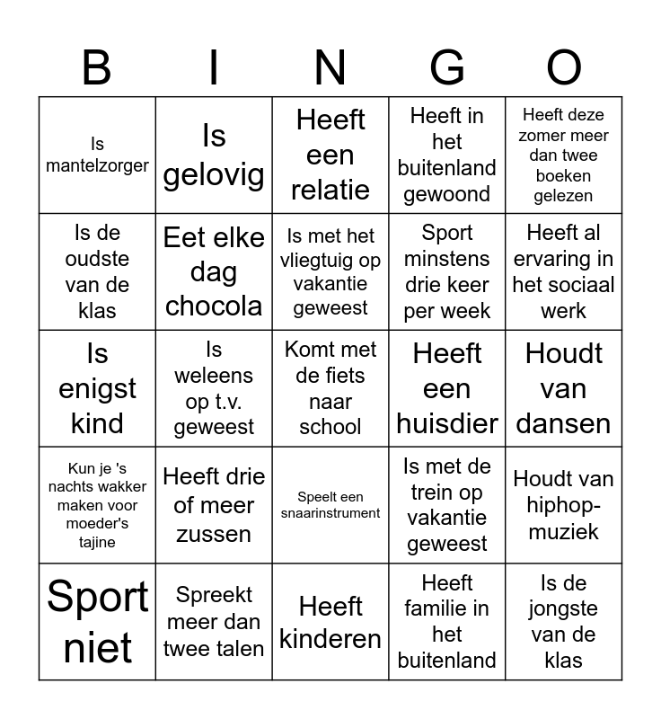 This bingo card has a free space and 24 words: Heeft drie of meer zussen, Spreekt meer dan twee talen, Is met het vliegtuig op vakantie geweest, Sport niet, Heeft deze zomer meer dan twee boeken gelezen, Is mantelzorger, Is de oudste van de klas, Is gelovig, Heeft een huisdier, Speelt een snaarinstrument, Sport minstens drie keer per week, Is enigst kind, Is met de trein op vakantie geweest, Houdt van hiphop-muziek, Eet elke dag chocola, Heeft familie in het buitenland, Houdt van dansen, Heeft een relatie, Heeft al ervaring in het sociaal werk, Is weleens op t.v. geweest, Is de jongste van de klas, Kun je 's nachts wakker maken voor moeder's tajine, Heeft in het buitenland gewoond and Heeft kinderen.