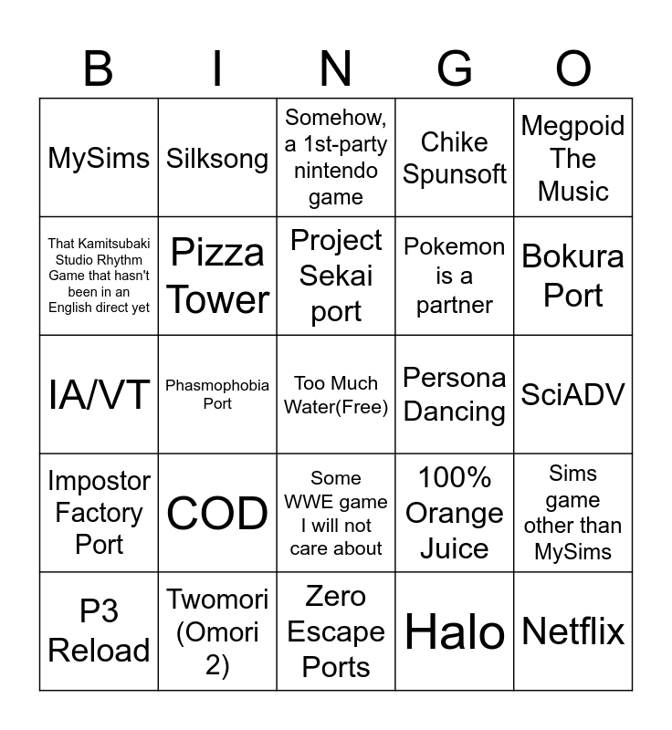 This bingo card has a free space and 24 words: COD, Twomori (Omori 2), Project Sekai port, P3 Reload, Megpoid The Music, MySims, That Kamitsubaki Studio Rhythm Game that hasn't been in an English direct yet, Silksong, Persona Dancing, Some WWE game I will not care about, Pokemon is a partner, IA/VT, 100% Orange Juice, Sims game other than MySims, Pizza Tower, Halo, SciADV, Somehow, a 1st-party nintendo game, Bokura Port, Phasmophobia Port, Netflix, Impostor Factory Port, Chike Spunsoft and Zero Escape Ports.