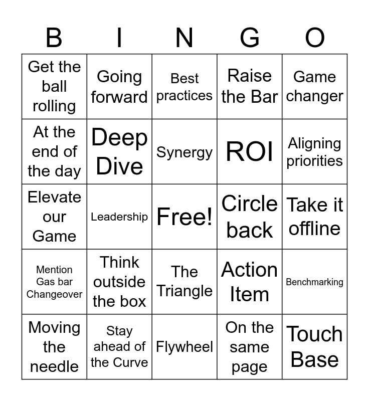 This bingo card has a free space and 24 words: Moving the needle, Think outside the box, Synergy, On the same page, Game changer, Get the ball rolling, Going forward, Best practices, Circle back, Take it offline, Elevate our Game, Deep Dive, Action Item, Benchmarking, At the end of the day, Stay ahead of the Curve, Flywheel, Raise the Bar, Aligning priorities, Mention Gas bar Changeover, Leadership, The Triangle, ROI and Touch Base.
