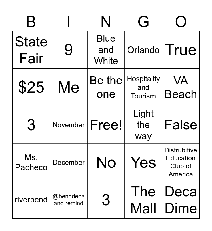 This bingo card has a free space and 24 words: December, @benddeca and remind, Be the one, riverbend, True, State Fair, $25, 9, Light the way, No, Hospitality and Tourism, 3, Yes, Distrubitive Education Club of America, Me, The Mall, False, Blue and White, VA Beach, November, Deca Dime, Ms. Pacheco, Orlando and 3.