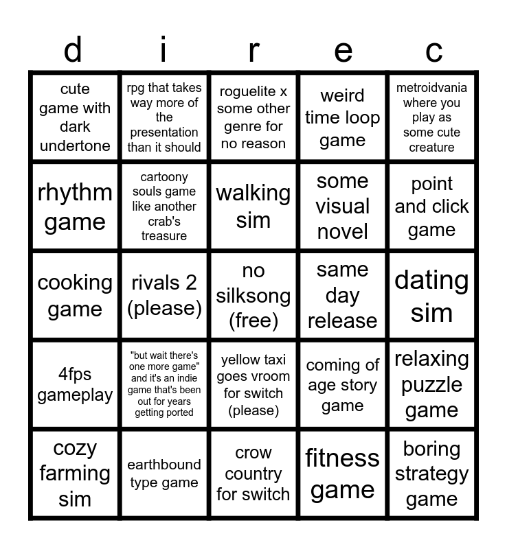 This bingo card has a free space and 24 words: "but wait there's one more game" and it's an indie game that's been out for years getting ported, earthbound type game, walking sim, cozy farming sim, metroidvania where you play as some cute creature, cute game with dark undertone, rhythm game, rpg that takes way more of the presentation than it should, same day release, yellow taxi goes vroom for switch (please), some visual novel, cooking game, coming of age story game, relaxing puzzle game, cartoony souls game like another crab's treasure, fitness game, dating sim, roguelite x some other genre for no reason, point and click game, rivals 2 (please), boring strategy game, 4fps gameplay, weird time loop game and crow country for switch.