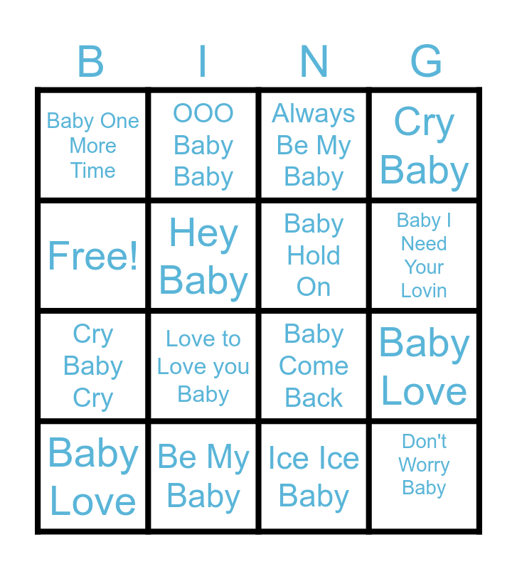 This bingo card has 16 words: Be My Baby, Baby Love, Always Be My Baby, Baby One More Time, Cry Baby Cry, OOO Baby Baby, Baby Come Back, Ice Ice Baby, Free!, Hey Baby, Baby Love, Cry Baby, Love to Love you Baby, Baby I Need Your Lovin, Baby Hold On and Don't Worry Baby.