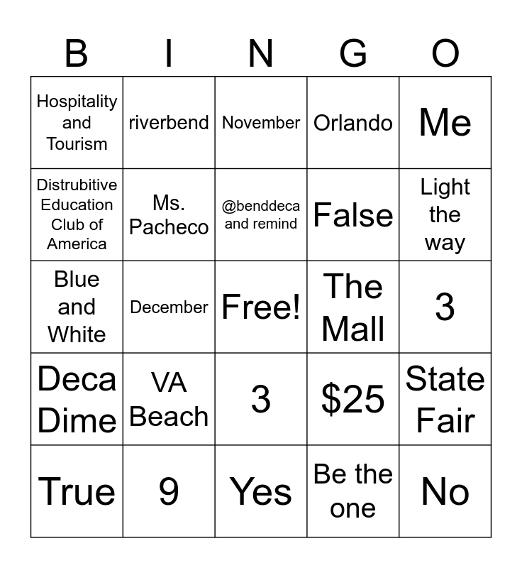 This bingo card has a free space and 24 words: VA Beach, 9, @benddeca and remind, True, Me, Hospitality and Tourism, Distrubitive Education Club of America, riverbend, The Mall, 3, False, Blue and White, $25, State Fair, Ms. Pacheco, Be the one, 3, November, Light the way, December, No, Deca Dime, Orlando and Yes.