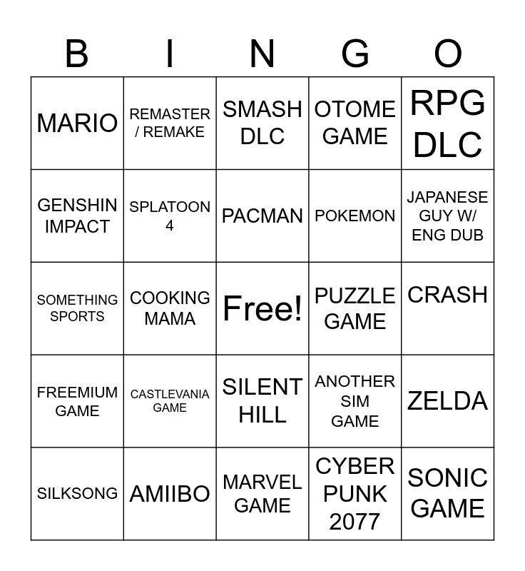 This bingo card has a free space and 24 words: SILKSONG, CASTLEVANIA GAME, PACMAN, CYBER PUNK 2077, RPG DLC, MARIO, REMASTER / REMAKE, SMASH DLC, PUZZLE GAME, CRASH, SOMETHING SPORTS, SPLATOON 4, ANOTHER SIM GAME, ZELDA, GENSHIN IMPACT, AMIIBO, MARVEL GAME, OTOME GAME, JAPANESE GUY W/ ENG DUB, FREEMIUM GAME, COOKING MAMA, SILENT HILL, POKEMON and SONIC GAME.