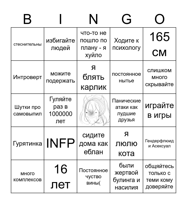 This bingo card has a free space and 24 words: INFP, 16 лет, я блять карлик, много комплексов, 165 см, стеснительны, Интроверт, избигайте людей, Панические атаки как лудшие друзья, сидите дома как еблан, постоянное нытье, Шутки про самовыпил, я люлю кота, Гендерфлюид и Асексуал, можите подержать, были жертвой булинга и насилия, играйте в игры, что-то не пошло по плану - я хуйло, слишком много скрывайте, Гуляйте раз в 1000000 лет, общяйтесь только с теми кому доверяйте, Гурятинка, Ходите к психологу and Постоянное чуство вины(.