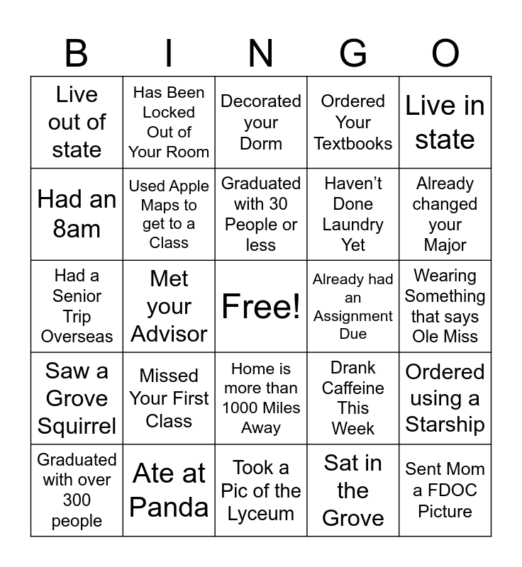 This bingo card has a free space and 24 words: Missed Your First Class, Ate at Panda, Graduated with 30 People or less, Graduated with over 300 people, Live in state, Live out of state, Had an 8am, Has Been Locked Out of Your Room, Already had an Assignment Due, Home is more than 1000 Miles Away, Haven’t Done Laundry Yet, Had a Senior Trip Overseas, Drank Caffeine This Week, Ordered using a Starship, Used Apple Maps to get to a Class, Sat in the Grove, Wearing Something that says Ole Miss, Decorated your Dorm, Already changed your Major, Met your Advisor, Sent Mom a FDOC Picture, Saw a Grove Squirrel, Ordered Your Textbooks and Took a Pic of the Lyceum.