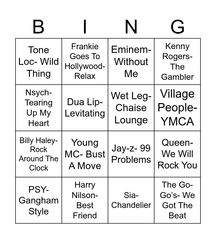 This bingo card has 27 words: Free!, Aretha Franklin- Respect, Billy Haley- Rock Around The Clock, Christina Augerlia- Genie in a Bottle, Dua Lip- Levitating, Eminem- Without Me, Frankie Goes To Hollywood- Relax, The Go-Go’s- We Got The Beat, Harry Nilson- Best Friend, Imagine Dragons- Thunder, Jay-z- 99 Problems, Kenny Rogers- The Gambler, Lady Gaga- Bad Romance, Metro- BBL Drizzy, Young MC- Bust A Move, Xzibit- X, Wet Leg- Chaise Lounge, Village People- YMCA, The Used- Taste of Ink, Tone Loc- Wild Thing, Sia- Chandelier, Right Said Fred- I’m Too Sexy, Queen- We Will Rock You, PSY-Gangham Style, Oasis- Wonderwall, Nsych- Tearing Up My Heart and Zac Brown- Chicken Fried.