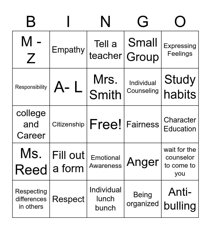 This bingo card has 2 images, a free space and 34 words: Help making friends, Being organized, Solving problems, Parent request, Ms. Reed, A- L, Expressing Feelings, Respecting differences in others, Empathy, Following Rules, Mrs. Smith, Tell a teacher, Confidentiality, Schedule changes, Fairness, Study habits, Respect, college and Career, Fill out a form, Anger, Emotional Awareness, Proactive Education, M - Z, Character Education, Individual lunch bunch, Anti- bulling, Small Group, Lunch Bunch, Individual Counseling, Responsibility, Caring, Citizenship, wait for the counselor to come to you and classroom guidance lessons.