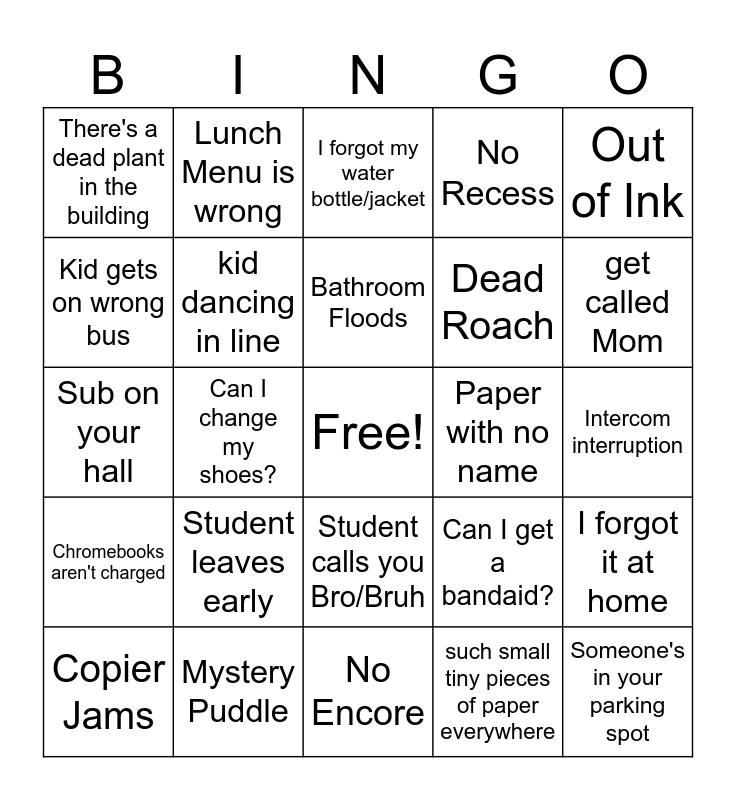 This bingo card has a free space and 24 words: Student leaves early, Mystery Puddle, Bathroom Floods, Copier Jams, Out of Ink, There's a dead plant in the building, Kid gets on wrong bus, Lunch Menu is wrong, Paper with no name, Student calls you Bro/Bruh, Dead Roach, Sub on your hall, Can I get a bandaid?, I forgot it at home, kid dancing in line, such small tiny pieces of paper everywhere, Intercom interruption, I forgot my water bottle/jacket, get called Mom, Can I change my shoes?, Someone's in your parking spot, Chromebooks aren't charged, No Recess and No Encore.