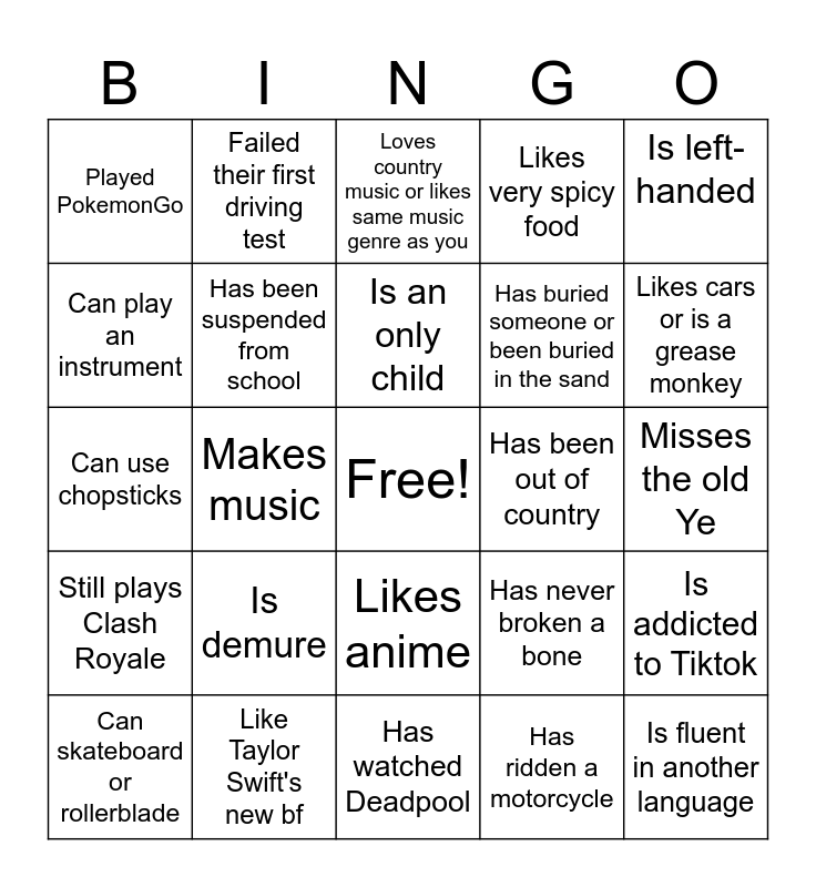 This bingo card has a free space and 24 words: Is demure, Like Taylor Swift's new bf, Is an only child, Can skateboard or rollerblade, Is left-handed, Played PokemonGo, Can play an instrument, Failed their first driving test, Has been out of country, Likes anime, Has buried someone or been buried in the sand, Can use chopsticks, Has never broken a bone, Is addicted to Tiktok, Has been suspended from school, Has ridden a motorcycle, Misses the old Ye, Loves country music or likes same music genre as you, Likes cars or is a grease monkey, Makes music, Is fluent in another language, Still plays Clash Royale, Likes very spicy food and Has watched Deadpool.