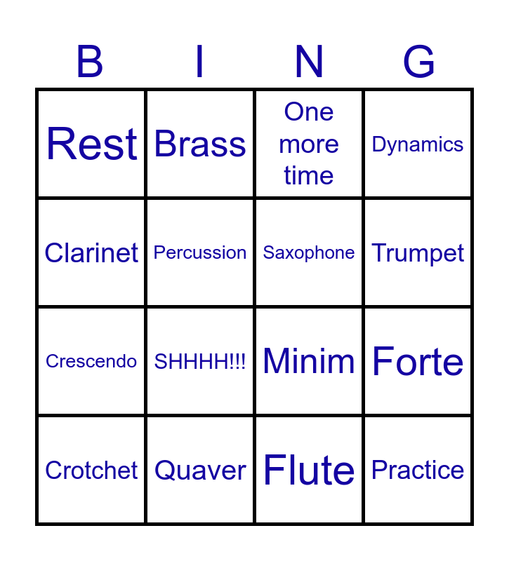 This bingo card has 17 words: Flute, Crotchet, One more time, Rest, SHHHH!!!, Dynamics, Forte, Saxophone, Trumpet, Percussion, Quaver, Minim, Clarinet, Brass, Crescendo, STOP!!! and Practice.