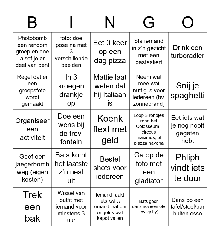 This bingo card has 42 words: Mattie checkt NOS op ongepast moment, Mattie laat weten dat hij Italiaan is, Bestel en proef wijn alsof je Mattie bent, Bats komt het laatste z’n nest uit, Bats gooit dansmove/emote (bv. gritty), Phliph vindt iets te duur, Koenk flext met geld, Koenk of Phliph spreekt een dame aan, Eet 3 keer op een dag pizza, Bestel shots voor iedereen, Eet iets wat je nog nooit gegeten hebt, Snij je spaghetti, Doe een wens bij de trevi fontein, Drink een turboradler, Bestel een cappuccino (koffie met iets van melk) na 11 uur ’s ochtends, Ga op de foto met een gladiator, Vraag de weg naar een bezienswaardigheid terwijl je er al bent, Organiseer een activiteit, Praat 3 min over een bezienswaardigheid zonder bs, foto: doe pose na met 3 verschillende beelden, Regel dat er een groepsfoto wordt gemaakt, Vraag om een foto met iemand die niet uit Italië of NL komt, Dans op een tafel/stoel/bar buiten osso, Photobomb een random groep en doe alsof je er deel van bent, Een moeder belt (zonder aan te sporen), Regel dat het ‘iemands verjaardag is’ in een eetgelegenheid, Neem wat mee wat nuttig is voor iedereen (bv. zonnebrand), Koop een souvenir, Videobel je vriendin/familie met de hele groep na min. 3 alc. vernsaperingen, Laat hanglamp bewegen (buiten osso), Haal shots voor iedereen (eigen kosten), Geef een jaegerbomb weg (eigen kosten), In 3 kroegen drankje op, Iemand raakt iets kwijt / iemand laat per ongeluk wat kapot vallen, Vereeuwig jouw 'reconstructie van de uitbarsting over Pompeii, op porselein’ in de groepsapp, Trek een bak, Wissel van outfit met iemand voor minstens 3 uur, Loop 3 rondjes rond het Colosseum , circcus maximus, of piazza navona, Doe elke (min. 2) bestelling bij één eetgelegenheid in het Italiaans, Drink uit een fontein, Sla iemand in z’n gezicht met een pastasliert and Er wordt door iemand anders een moeder grap gemaakt.