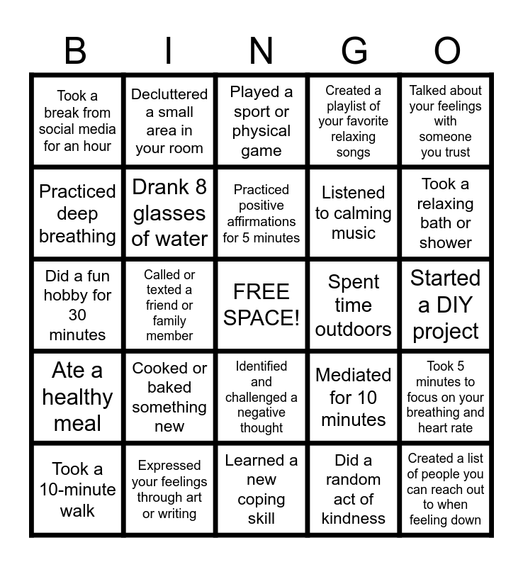 This bingo card has a free space and 29 words: Took a 10-minute walk, Sat quietly and observed your surroundings for 5 minutes, Called or texted a friend or family member, Spent quality time with a pet, Took a break from social media for an hour, Played a sport or physical game, Drank 8 glasses of water, Cooked or baked something new, Spent time outdoors, Expressed your feelings through art or writing, Started a DIY project, Created a list of people you can reach out to when feeling down, Learned a new coping skill, Did a random act of kindness, Took a relaxing bath or shower, Got at least 8 hours of sleep, Identified and challenged a negative thought, Ate a healthy meal, Talked about your feelings with someone you trust, Did a fun hobby for 30 minutes, Mediated for 10 minutes, Wrote in a journal about your day, Listened to calming music, Practiced deep breathing, Created a playlist of your favorite relaxing songs, Decluttered a small area in your room, Took 5 minutes to focus on your breathing and heart rate, Practiced positive affirmations for 5 minutes and Unplugged from technology for 2 hours.