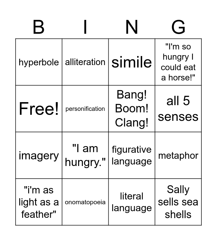 This bingo card has 16 words: onomatopoeia, metaphor, simile, hyperbole, imagery, alliteration, figurative language, literal language, Free!, personification, "i'm as light as a feather", "I'm so hungry I could eat a horse!", "I am hungry.", all 5 senses, Bang! Boom! Clang! and Sally sells sea shells.