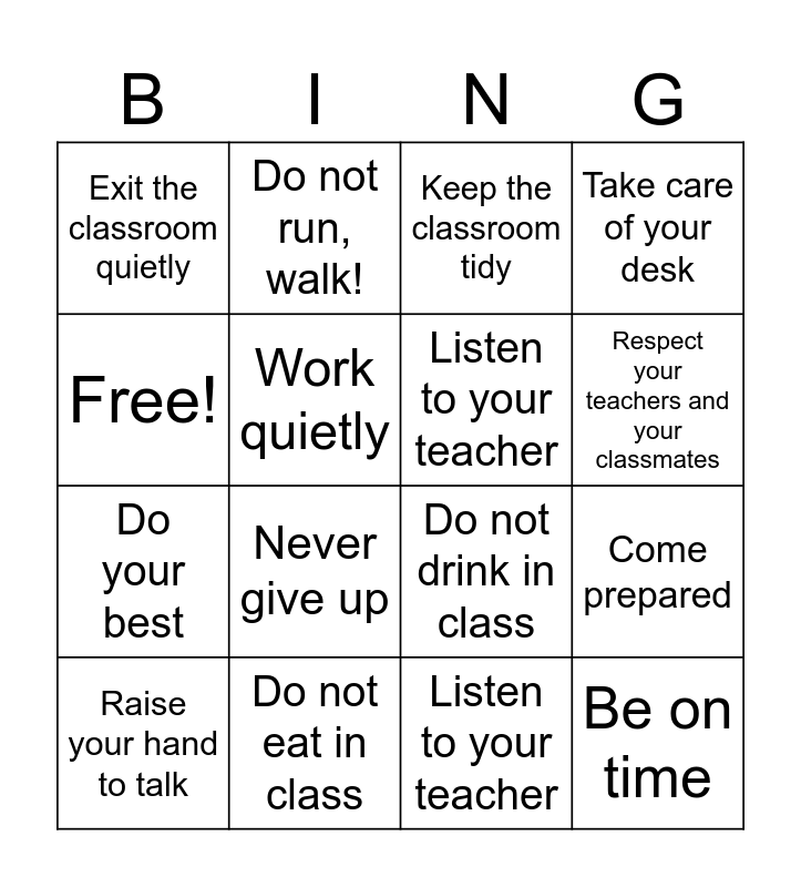 This bingo card has 16 words: Do not eat in class, Come prepared, Keep the classroom tidy, Exit the classroom quietly, Do your best, Do not run, walk!, Do not drink in class, Listen to your teacher, Free!, Work quietly, Raise your hand to talk, Take care of your desk, Never give up, Respect your teachers and your classmates, Listen to your teacher and Be on time.