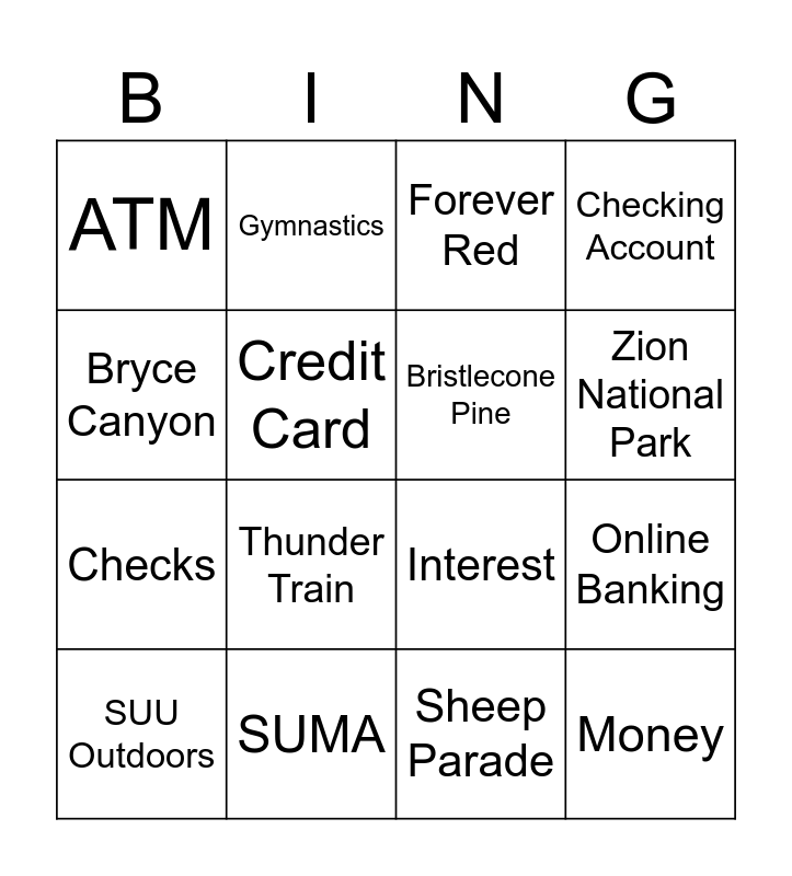 This bingo card has 36 words: Free!, State Bank, SUU, Bristlecone Pine, Community Bank, Money, Zion National Park, Bell Tower, Bryce Canyon, Cedar City, Online Banking, Checking Account, Red Fridays, SUMA, Thunder Train, ATM, Thor, Writing Center, SUU Outdoors, Forever Red, Sheep Parade, Direct Deposit, Home Loans, Football, Volleyball, Gymnastics, Interest, Debit Card, Checks, Credit Card, Fraud Prevention, Coins, Bachelor’s degree, Master’s degree, Honors and Career Center.