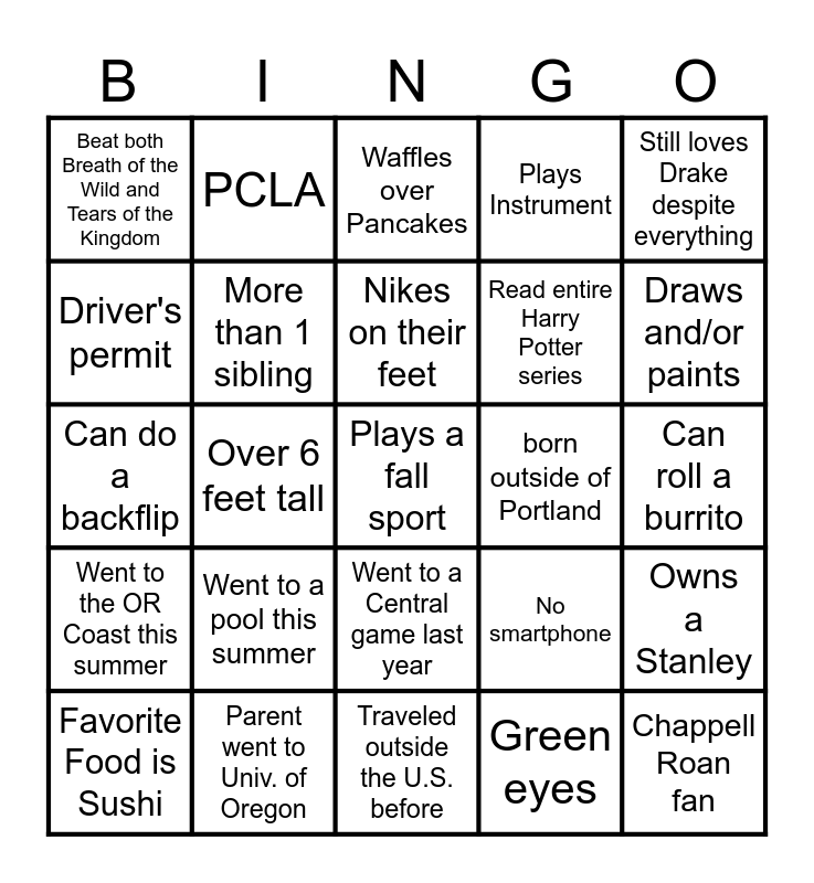 This bingo card has 25 words: Went to the OR Coast this summer, Parent went to Univ. of Oregon, Plays a fall sport, Green eyes, Still loves Drake despite everything, Beat both Breath of the Wild and Tears of the Kingdom, PCLA, Waffles over Pancakes, born outside of Portland, Owns a Stanley, Driver's permit, More than 1 sibling, Traveled outside the U.S. before, No smartphone, Draws and/or paints, Favorite Food is Sushi, Over 6 feet tall, Nikes on their feet, Read entire Harry Potter series, Can roll a burrito, Can do a backflip, Went to a pool this summer, Went to a Central game last year, Plays Instrument and Chappell Roan fan.