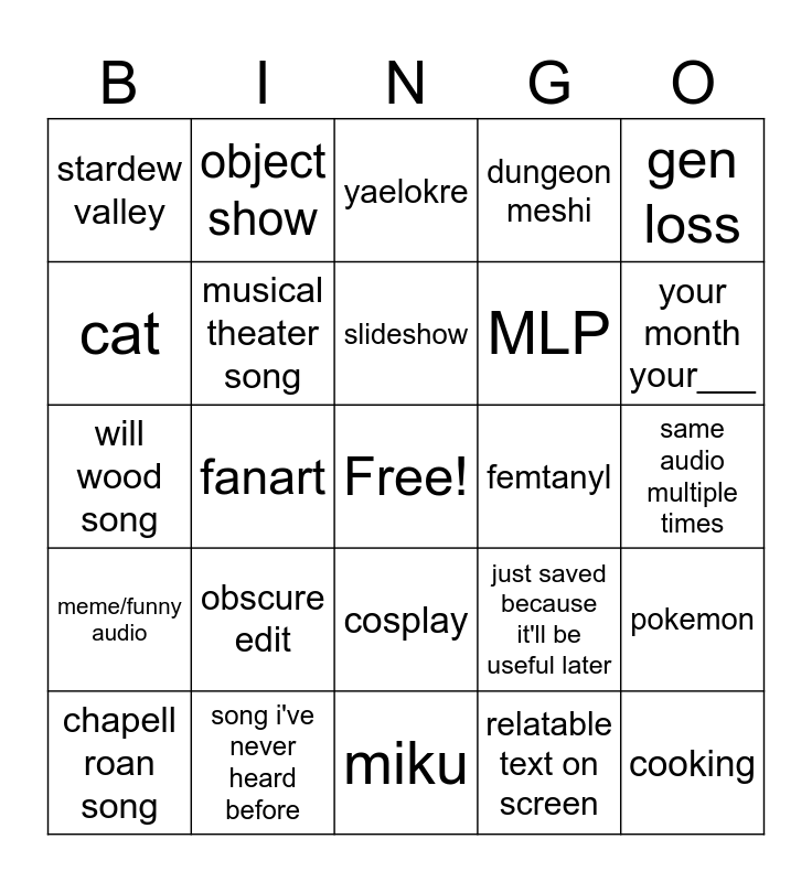 This bingo card has a free space and 24 words: obscure edit, song i've never heard before, slideshow, chapell roan song, gen loss, stardew valley, cat, object show, femtanyl, cosplay, MLP, will wood song, just saved because it'll be useful later, pokemon, musical theater song, relatable text on screen, same audio multiple times, yaelokre, your month your___, fanart, cooking, meme/funny audio, dungeon meshi and miku.