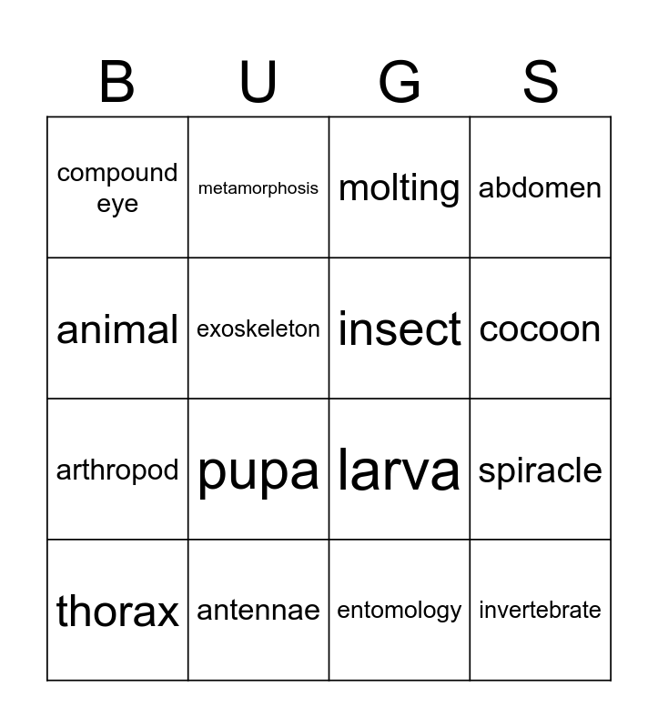 This bingo card has 16 words: antennae, spiracle, molting, compound eye, arthropod, metamorphosis, larva, entomology, animal, exoskeleton, thorax, abdomen, pupa, cocoon, insect and invertebrate.