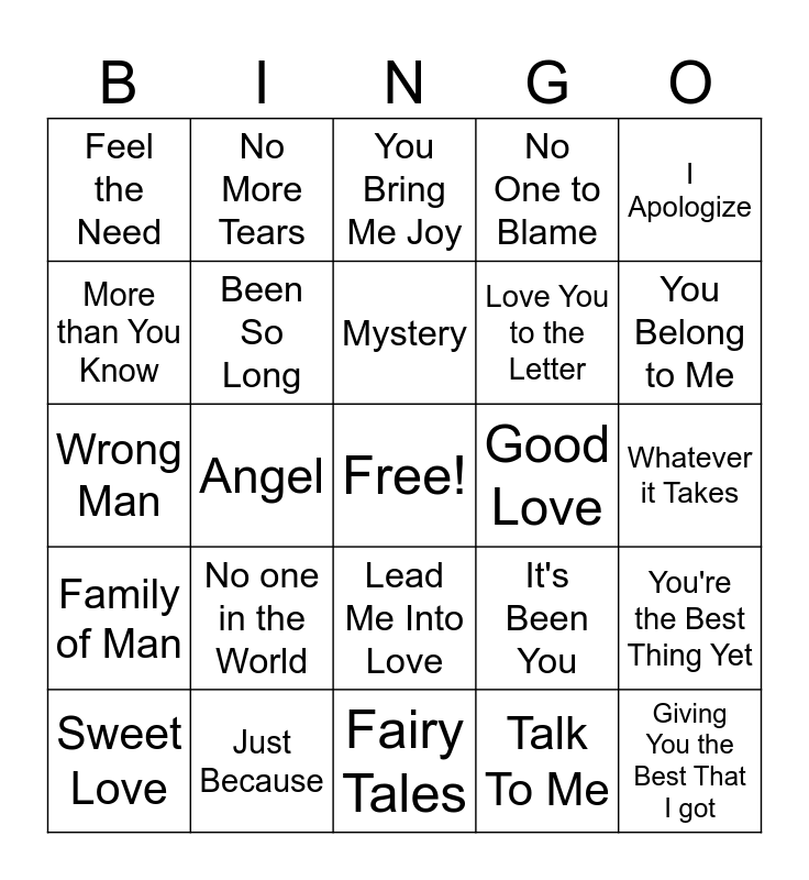 This bingo card has a free space and 29 words: Sweet Love, Caught Up in The Rapture, Angel, Same Ol Love, Feel the Need, You Bring Me Joy, Been So Long, No one in the World, Good Love, Just Because, Whatever it Takes, Giving You the Best That I got, Fairy Tales, Talk To Me, You Belong to Me, Body and Soul, Lead Me Into Love, Family of Man, I Apologize, Wrong Man, It's Been You, Only for a While, Love You to the Letter, More than You Know, No One to Blame, No More Tears, You're the Best Thing Yet, Mystery and My Favorite Things.