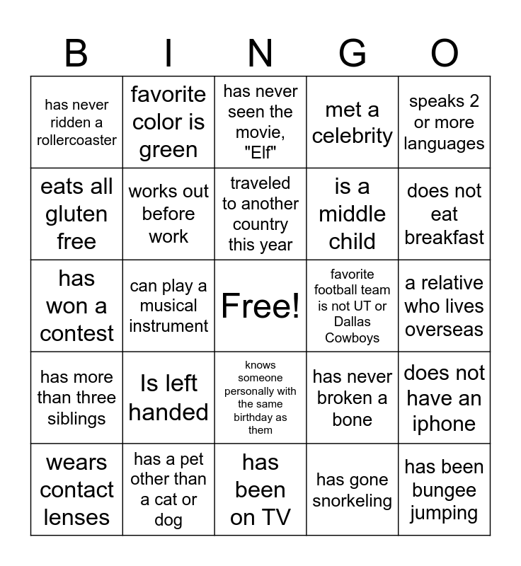 This bingo card has a free space and 24 words: Is left handed, has a pet other than a cat or dog, traveled to another country this year, wears contact lenses, speaks 2 or more languages, has never ridden a rollercoaster, eats all gluten free, favorite color is green, favorite football team is not UT or Dallas Cowboys, knows someone personally with the same birthday as them, is a middle child, has won a contest, has never broken a bone, does not have an iphone, works out before work, has gone snorkeling, a relative who lives overseas, has never seen the movie, "Elf", does not eat breakfast, can play a musical instrument, has been bungee jumping, has more than three siblings, met a celebrity and has been on TV.