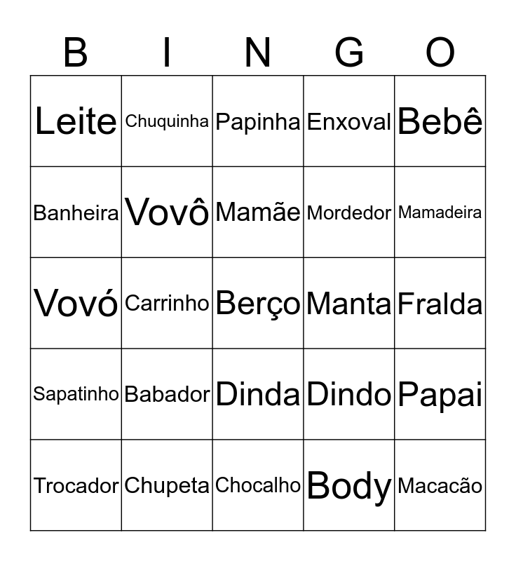 This bingo card has a free space and 24 words: Babador, Chupeta, Mamãe, Trocador, Bebê, Leite, Banheira, Chuquinha, Manta, Dinda, Mordedor, Vovó, Dindo, Papai, Vovô, Body, Fralda, Papinha, Mamadeira, Carrinho, Macacão, Sapatinho, Enxoval and Chocalho.