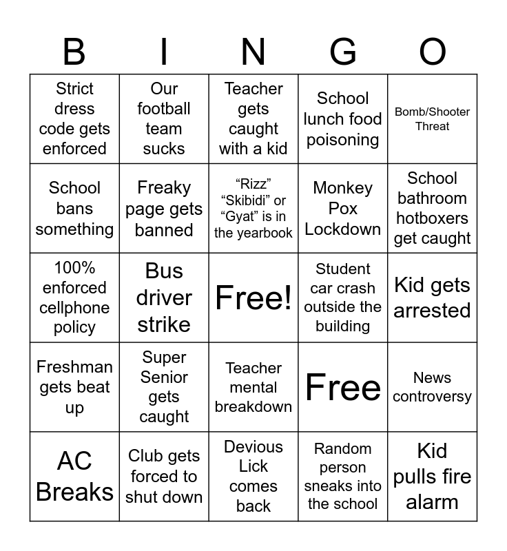This bingo card has a free space and 25 words: Super Senior gets caught, Devious Lick comes back, “Rizz” “Skibidi” or “Gyat” is in the yearbook, AC Breaks, Bomb/Shooter Threat, Strict dress code gets enforced, School bans something, Our football team sucks, Student car crash outside the building, Teacher mental breakdown, Monkey Pox Lockdown, 100% enforced cellphone policy, Free, News controversy, Freaky page gets banned, Wild animal in the school, Kid gets arrested, Teacher gets caught with a kid, School bathroom hotboxers get caught, Bus driver strike, Kid pulls fire alarm, Club gets forced to shut down, Freshman gets beat up, School lunch food poisoning and Random person sneaks into the school.