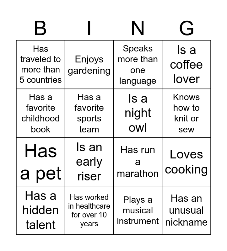 This bingo card has 16 words: Has worked in healthcare for over 10 years, Loves cooking, Speaks more than one language, Has traveled to more than 5 countries, Has a pet, Enjoys gardening, Has run a marathon, Plays a musical instrument, Has a favorite childhood book, Has a favorite sports team, Has a hidden talent, Is a coffee lover, Is an early riser, Knows how to knit or sew, Is a night owl and Has an unusual nickname.