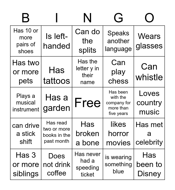 This bingo card has a free space and 24 words: Has read two or more books in the past month, Does not drink coffee, Has the letter y in their name, Has 3 or more siblings, Wears glasses, Has 10 or more pairs of shoes, Has two or more pets, Is left-handed, Has been with the company for more than five years, Has broken a bone, Can play chess, Plays a musical instrument, likes horror movies, Has met a celebrity, Has tattoos, is wearing something blue, Loves country music, Can do the splits, Can whistle, Has a garden, Has been to Disney, can drive a stick shift, Speaks another language and Has never had a speeding ticket.