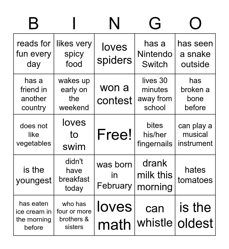 This bingo card has a free space and 25 words: didn't have breakfast today, loves math, won a contest, has eaten ice cream in the morning before, has seen a snake outside, reads for fun every day, has a friend in another country, likes very spicy food, bites his/her fingernails, was born in February, lives 30 minutes away from school, does not like vegetables, drank milk this morning, hates tomatoes, wakes up early on the weekend, wears socks to bed, can play a musical instrument, loves spiders, has broken a bone before, loves to swim, is the oldest, who has four or more brothers & sisters, is the youngest, has a Nintendo Switch and can whistle.