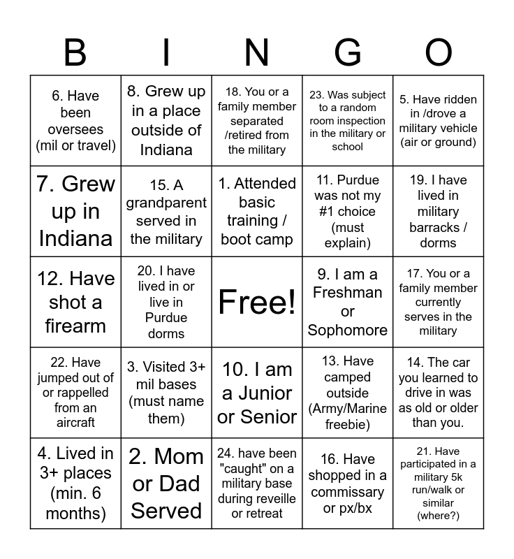 This bingo card has a free space and 24 words: 3. Visited 3+ mil bases (must name them), 2. Mom or Dad Served, 1. Attended basic training / boot camp, 4. Lived in 3+ places (min. 6 months), 5. Have ridden in /drove a military vehicle (air or ground), 6. Have been oversees (mil or travel), 7. Grew up in Indiana, 8. Grew up in a place outside of Indiana, 9. I am a Freshman or Sophomore, 10. I am a Junior or Senior, 11. Purdue was not my #1 choice (must explain), 12. Have shot a firearm, 13. Have camped outside (Army/Marine freebie), 14. The car you learned to drive in was as old or older than you., 15. A grandparent served in the military, 16. Have shopped in a commissary or px/bx, 17. You or a family member currently serves in the military, 18. You or a family member separated /retired from the military, 19. I have lived in military barracks / dorms, 20. I have lived in or live in Purdue dorms, 21. Have participated in a military 5k run/walk or similar (where?), 22. Have jumped out of or rappelled from an aircraft, 23. Was subject to a random room inspection in the military or school and 24. have been "caught" on a military base during reveille or retreat.