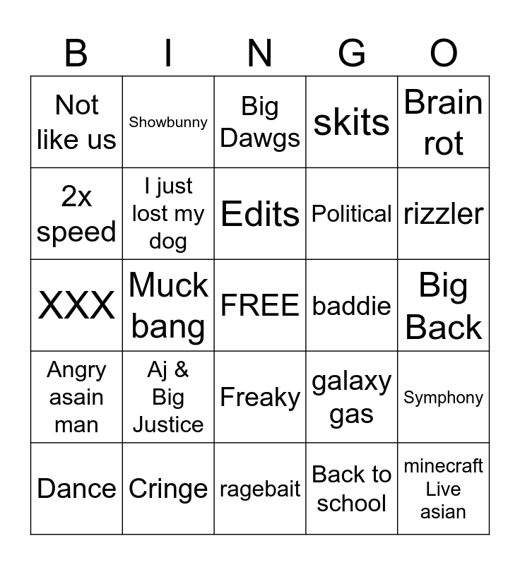 This bingo card has a free space and 24 words: Aj & Big Justice, Cringe, Edits, Dance, Brain rot, Not like us, 2x speed, Showbunny, baddie, Freaky, Political, XXX, galaxy gas, Symphony, I just lost my dog, Back to school, Big Back, Big Dawgs, rizzler, Muck bang, minecraft Live asian, Angry asain man, skits and ragebait.
