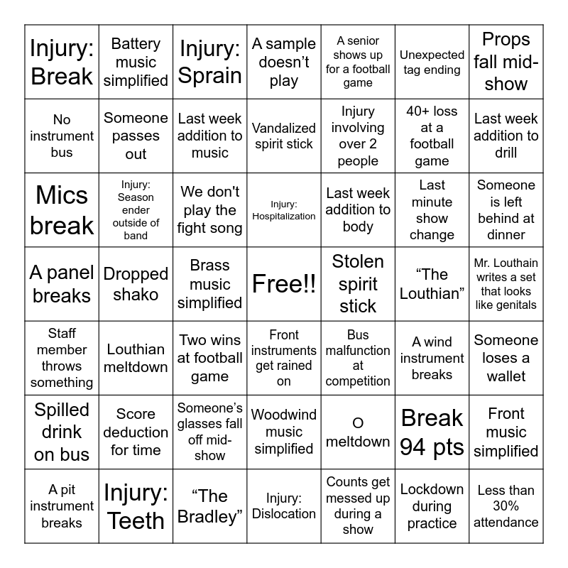 This bingo card has a free space and 70 words: Late bus, Mics break, A drum breaks, A wind instrument breaks, A panel breaks, A stage breaks, A sample doesn’t play, A pit instrument breaks, A senior shows up for a football game, Mango shirts v3, Last minute show change, Injury: Dislocation, Injury: Break, Injury: Sprain, Injury: Concussion, Injury involving over 2 people, Injury: Hospitalization, Someone passes out, Injury: Teeth, Injury: Season ender outside of band, Last week addition to drill, Last week addition to body, Last week addition to music, “The Louthian”, Louthian meltdown, O meltdown, Score deduction for time, Woodwind music simplified, Brass music simplified, Front music simplified, Battery music simplified, “The Bradley”, Forgotten instrument, Forgotten costume, Bus malfunction at competition, Front instruments get rained on, Counts get messed up during a show, Collision with a tuba, Staff member throws something, Unexpected tag ending, Less than 30% attendance, We don't play the fight song, 40+ loss at a football game, Opening kickoff touchdown, Instrument falls mid-show, Props fall mid-show, Someone is left behind at dinner, Someone loses a wallet, Someone brings a whole meal back on the bus, Spilled drink on bus, Break 94 pts, Odd purchase during comp dinner, Mr. Louthain writes a set that looks like genitals, Two wins at football game, Dropped shako, Lost shako, No instrument bus, Caption judges step out of their lane, Mr. Louthian yells at a judge, Stolen spirit stick, Vandalized spirit stick, A phone falls out of a uniform during competition, Staff member stop sign, Someone’s glasses fall off mid-show, Lockdown during practice, Competition is stormed out, Indoor competition due to weather, Skipped competition, Ruined uniform and Fight at a football game.